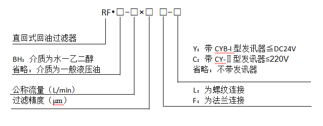注:*为过滤精度,若使用介质为水—乙二醇,公称流量160L/min,过滤精度10μm,带CYB—I型发讯器,则过滤型号为RF•BH-160×10Y,滤芯型号为HL00160R010BN/HC。